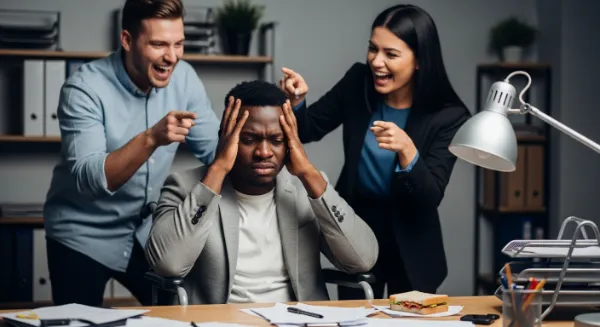 Scenario: Mark is a sales rep who’s meeting his targets, but a clique of senior co-workers is determined to make his life miserable. They belittle him openly, calling him “dead weight” and laughing at his ideas. One colleague has even started shouting at Mark over minor issues and bumping into him in the hallway. Mark now dreads coming to work; he’s anxious and his performance is beginning to suffer.